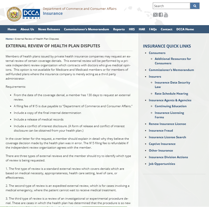 Learn how to submit your external review request to the Hawaii Insurance Division here.